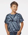Dyenomite Youth 5.3 Ounce Cyclone Monotone Swirl T-Shirt. 5.3 ounce 100% cotton tees over dyed with a monotone swirl pattern. Double-needle stitched neckline and bottom hem.