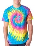 Dyenomite Adult 5.3 Ounce Tie Dye Ripple Spiral T-Shirt. Preshrunk, 100% cotton. Double-needle stitched neckline and bottom hem. Dyed with pigment dye.