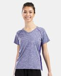 Holloway Ladies Electrify CoolCore Short Sleeve T-Shirt. 87% polyester/13% elastane heathered wicking knit with CoolCore copyright technology. 92% polyester knitted mesh/8% elastane wicking knit inserts with CoolCore technology. Garment protects against the sun with 50+ UPF on body, 25+ on mesh inserts. Wicks moisture. Tagless label. V-neck collar. Ladies' fit. Raglan Sleeves.