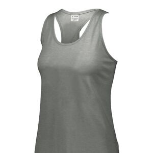 Augusta Ladies Triblend Tank. 3.8 ounce, 50% polyester/25% cotton/25% rayon tri-blend knit. Ladies' fit. Fits loose to body. Tear away label. Scoop neck. Racerback with keyhole. Contoured bottom