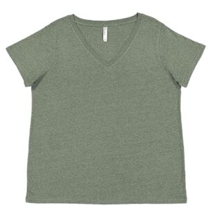 LAT Ladies' Curvy Fit V-Neck Fine Jersey Short Sleeve Tee. 4.5 ounce 60% combed ringspun cotton/40% polyester fine jersey. Heather is 90% combed ringspun cotton/10% polyester. Natural Heather is 100% combed ringspun cotton. Ribbed v-neck collar. Self-fabric back neck tape. Double needle sleeves and bottom hem. Side seam construction. EasyTear label.
