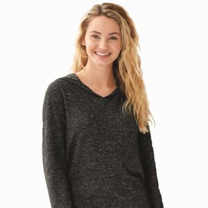 J-America Ladies Cozy Pullover Hood. 5.75oz 68% Polyester 24% Rayon 4% Spandex. Heathered Brushed Jersey. V-cut neckline. Self fabric cuffs with thumbholes. Rounded hemline.