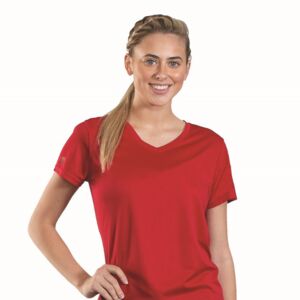 Holloway Ladies Poly Momentum Short Sleeve T-Shirt. Dry Excel 100% polyester interlock smooth knit with color secure technology that helps prevent dye migration. Wicks moisture. Odor resistant. Tagless label. V-neck collar. Garment protects against the sun with 45+ UPF. Set-in sleeves.