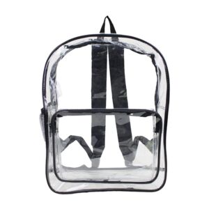 Liberty Bags Large 17 Heavy Duty Clear Backpack. Heavy duty 0.3mm clear PVC material. Large clear zippered pocket. Zippered front accessory pocket. Padded adjustable straps. Loop handle. Side mesh pocket for a water bottle. 13 x 17 x 6.5. Non-branded label/tag.