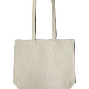 Midweight 100% recycled canvas. Fabric is 75% recycled cotton and 25% recycled polyester. 32 long self-fabric handles with 16 drop. Gusset bottom.Non-branded label/tag. Size: 17.75w x 15.75h x 6.25d.